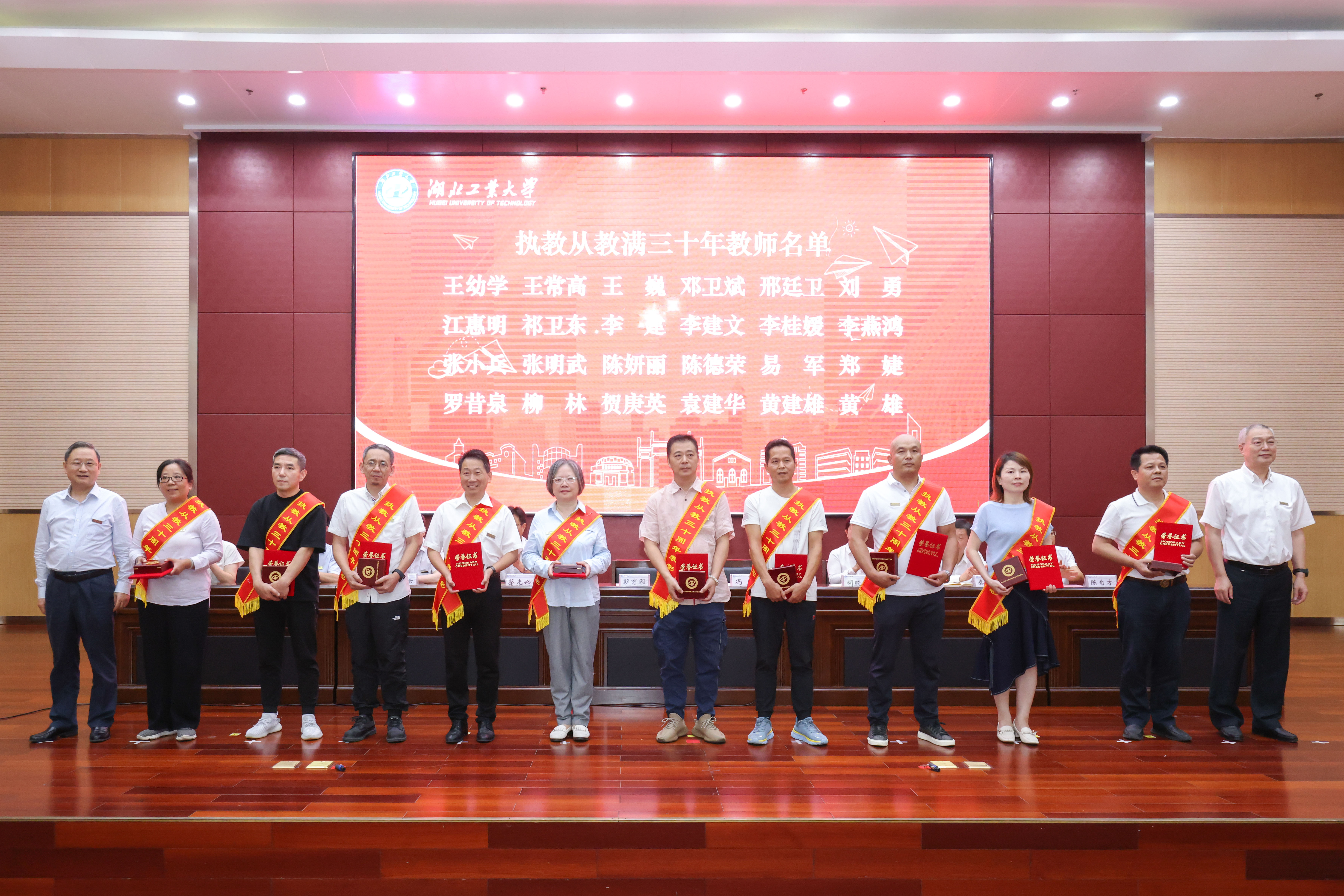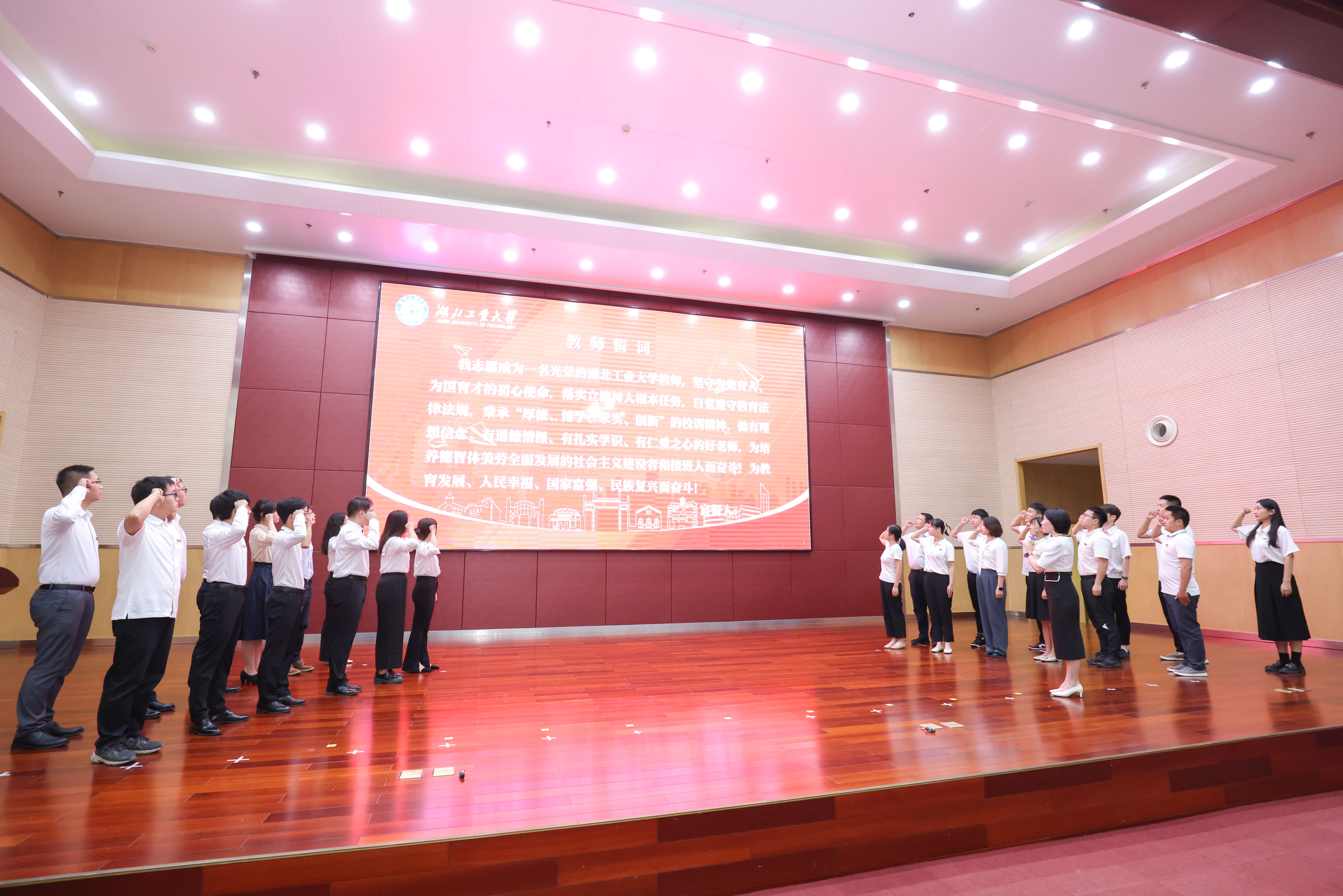 大会为150余名新教师举行了入职仪式。由荣休教师和教从教满三十周年教师代表为新教师佩戴校徽,并且在湖北名师、土木建筑与环境学院黄艳雁教授带领下,进行了教师宣誓。