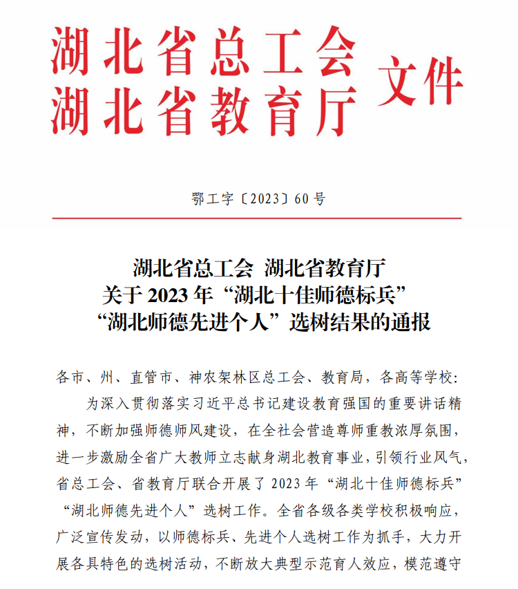 “湖北十佳师德标兵”“湖北师德先进个人”选树活动自2023年10月启动,经过全省各级各类学校广泛宣传发动、组织申报、民主评议、遴选推荐,上级工会审核初评、组织专家评审、媒体公示等程序,省总工会、省教育厅决定命名“湖北十佳师德标兵”10名,“湖北师德先进个人”30名。