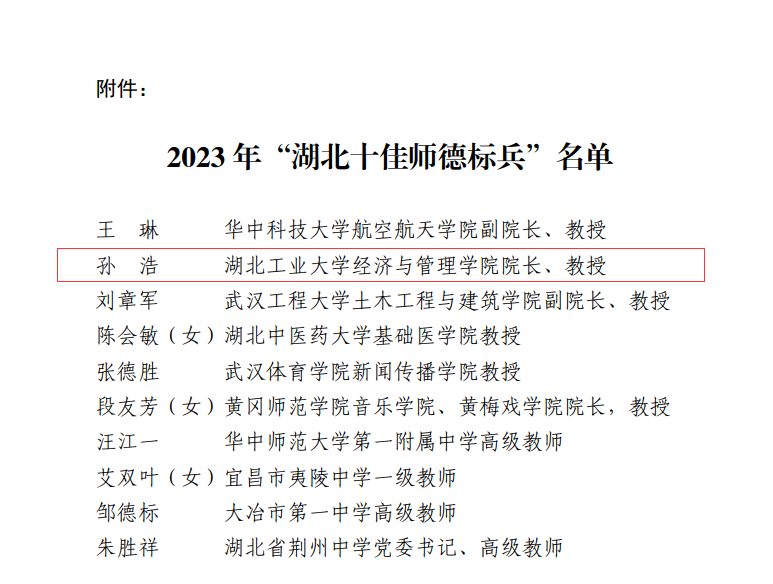 日前,湖北省总工会 湖北省教育厅联合印发《关于2023年“湖北十佳师德标兵”“湖北师德先进个人”选树结果的通报》(以下简称《通报》),我校经济与管理学院院长孙浩教授荣获“湖北十佳师德标兵”。