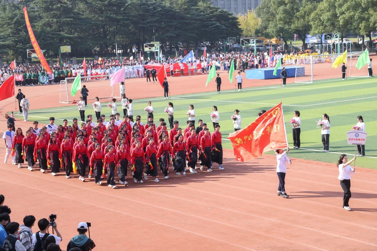 伴随着雄壮激昂的《运动员进行曲》,包括国旗护卫队、彩旗鲜花队、各学院学生代表队、教工代表在内的40个检阅队伍依次走过主席台,接受大会检阅。检阅人员服装整齐,精神饱满,口号响亮,步伐矫健,文创表演、各显风骚,展现了我校师生良好的精神风貌。