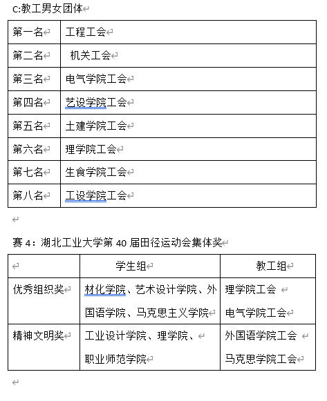 据悉,本届田径运动会比赛分广播体操比赛、体质测试大比武、田径比赛三个单元板块依次进行,比赛精彩纷呈、环环相扣、高潮不断。田径比赛板块竞赛项目共设14项,含拔河、跳绳、异程接力3大团体项目,学生组1113人次,教工组681人次,共2500人次参赛。据不完全统计,广播比赛、体质测试大比武、田径比赛三大板块得参赛人数,加上开、闭幕式及运动会相关人员人数高达16000人次以上,创历史新高。本届田径运动会提出“强健体魄、湖工筑梦、不负韶华、青春飞扬”的办赛宗旨基本达成,校园体育文化氛围持续高涨,取得体育竞赛和精神文化双丰收。