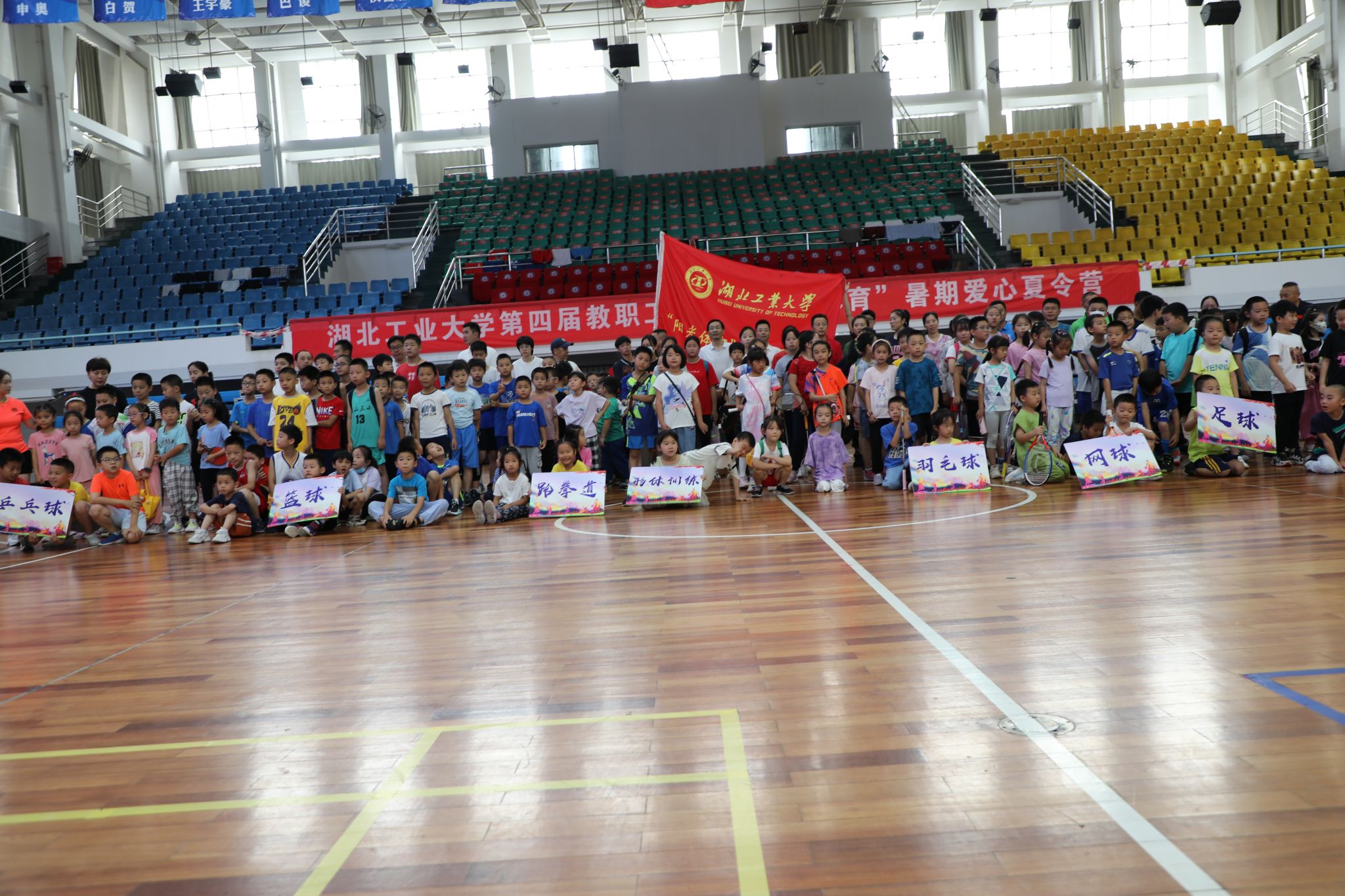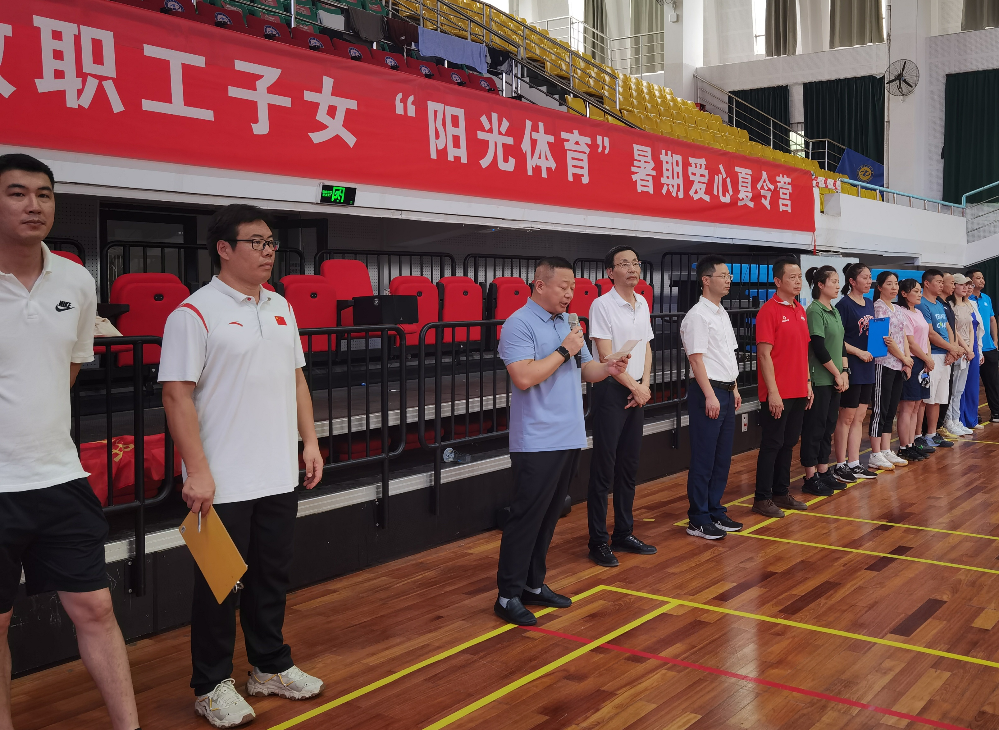 湖北工业大学第四届教职工子弟“阳光体育”爱心夏令营活动于7月3日上午正式开营,来自全校各单位(部门)的150余名教职工子弟共聚校体育馆篮球馆,在一片欢声笑语中开启了此次的为期10天的爱心夏令营之旅。校工会常务副主席周晓、校医院党总支书记任卫华、体育学院党委副书记张家盛、体育学院副院长夏令营营长徐宣、夏令营指导教师及百余名教职工出席开营活动。