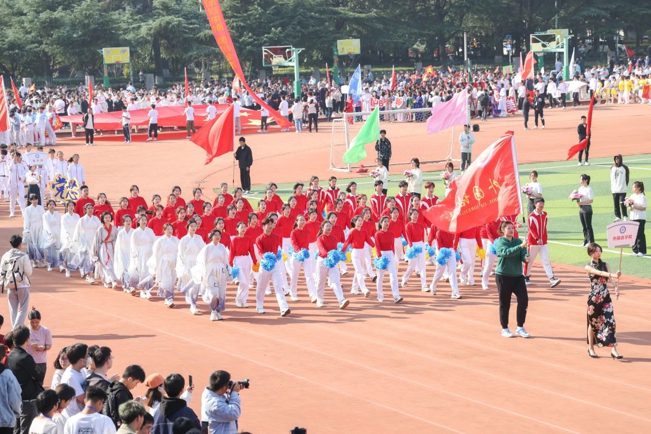 伴随着雄壮激昂的《运动员进行曲》,包括国旗护卫队、彩旗鲜花队、各学院学生代表队、教工代表在内的40个检阅队伍依次走过主席台,接受大会检阅。检阅人员服装整齐,精神饱满,口号响亮,步伐矫健,文创表演、各显风骚,展现了我校师生良好的精神风貌。