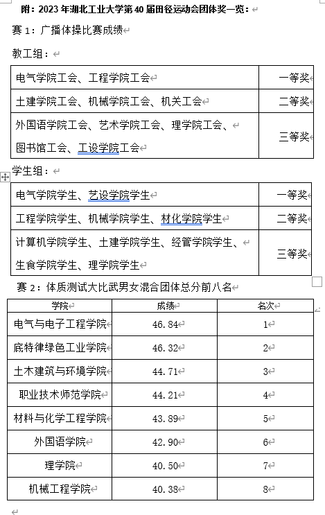 据悉,本届田径运动会比赛分广播体操比赛、体质测试大比武、田径比赛三个单元板块依次进行,比赛精彩纷呈、环环相扣、高潮不断。田径比赛板块竞赛项目共设14项,含拔河、跳绳、异程接力3大团体项目,学生组1113人次,教工组681人次,共2500人次参赛。据不完全统计,广播比赛、体质测试大比武、田径比赛三大板块得参赛人数,加上开、闭幕式及运动会相关人员人数高达16000人次以上,创历史新高。本届田径运动会提出“强健体魄、湖工筑梦、不负韶华、青春飞扬”的办赛宗旨基本达成,校园体育文化氛围持续高涨,取得体育竞赛和精神文化双丰收。