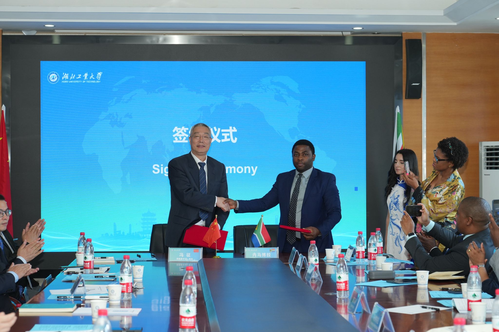 马纳梅拉对我校的热情接待表示衷心感谢。他指出,湖北工业大学对非合作的显著成效令代表团成员印象深刻,他非常欣慰地看到学校与南非多所高校及相关政府部门及企业已经有了深入务实的合作,尤其是与南非文达大学共建的绿色科技孔子学院,除了开展语言教学之外,还在开展光伏氢能等方面的科研合作。他欢迎湖北工业大学和南非更多高校及科研机构建立战略伙伴关系,在学术交流、人才培养、联合科研、技术创新等方面开展务实合作。他表示,南非高教科创部作为推进高教及科学创新领域国际合作的主要政府部门,将不遗余力地支持以湖北工业大学为代表的中国高校与南非高校及企业的交流合作。