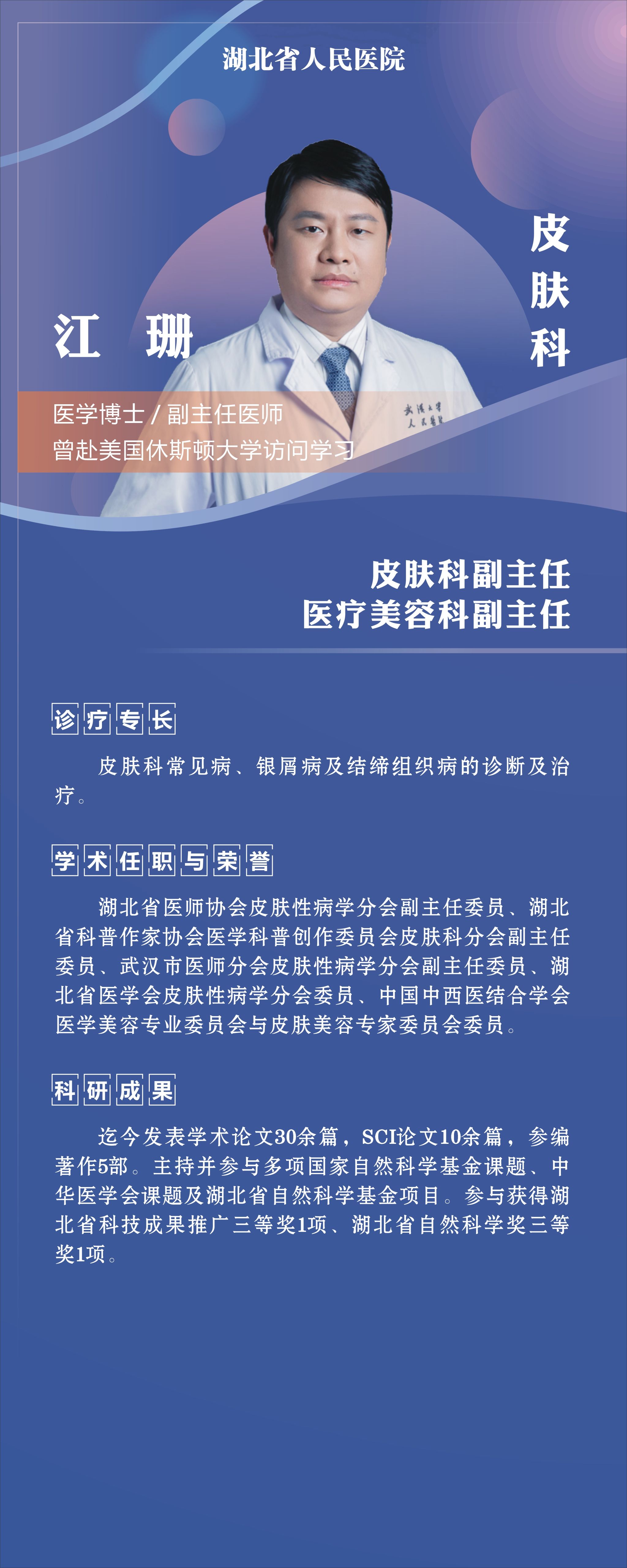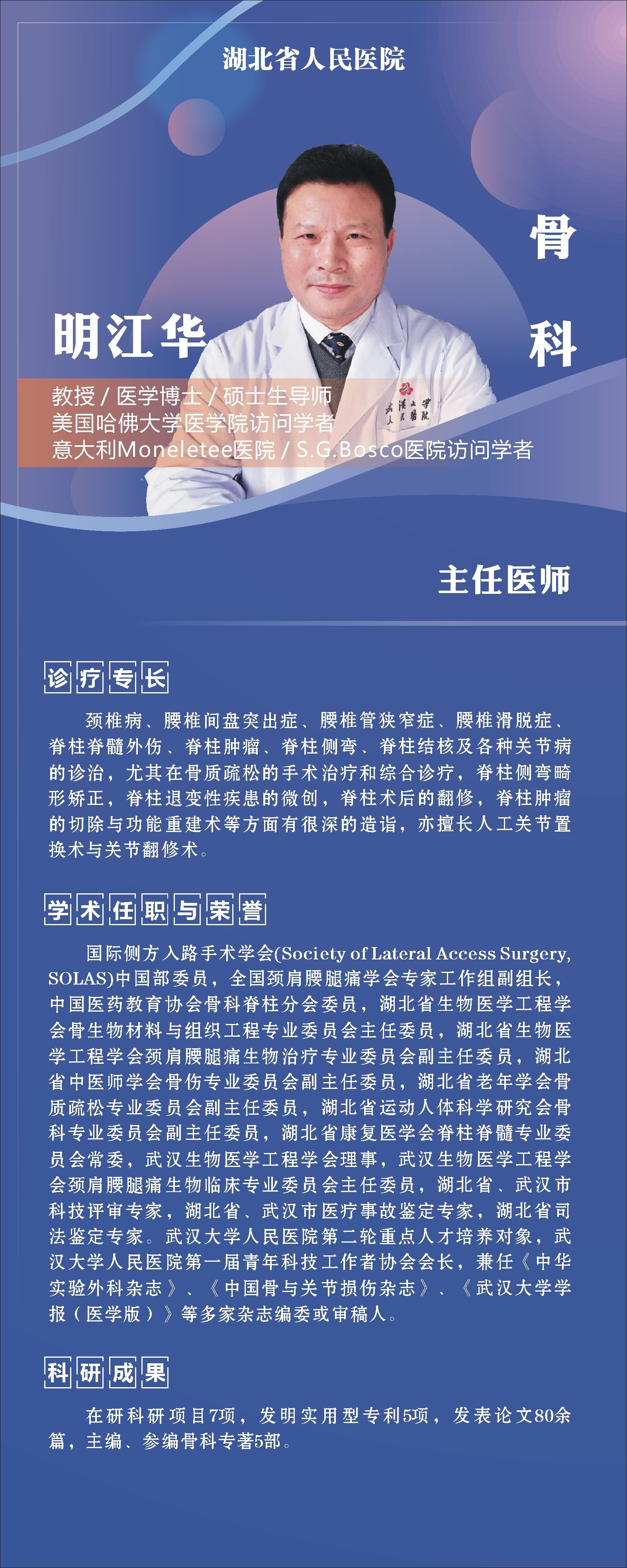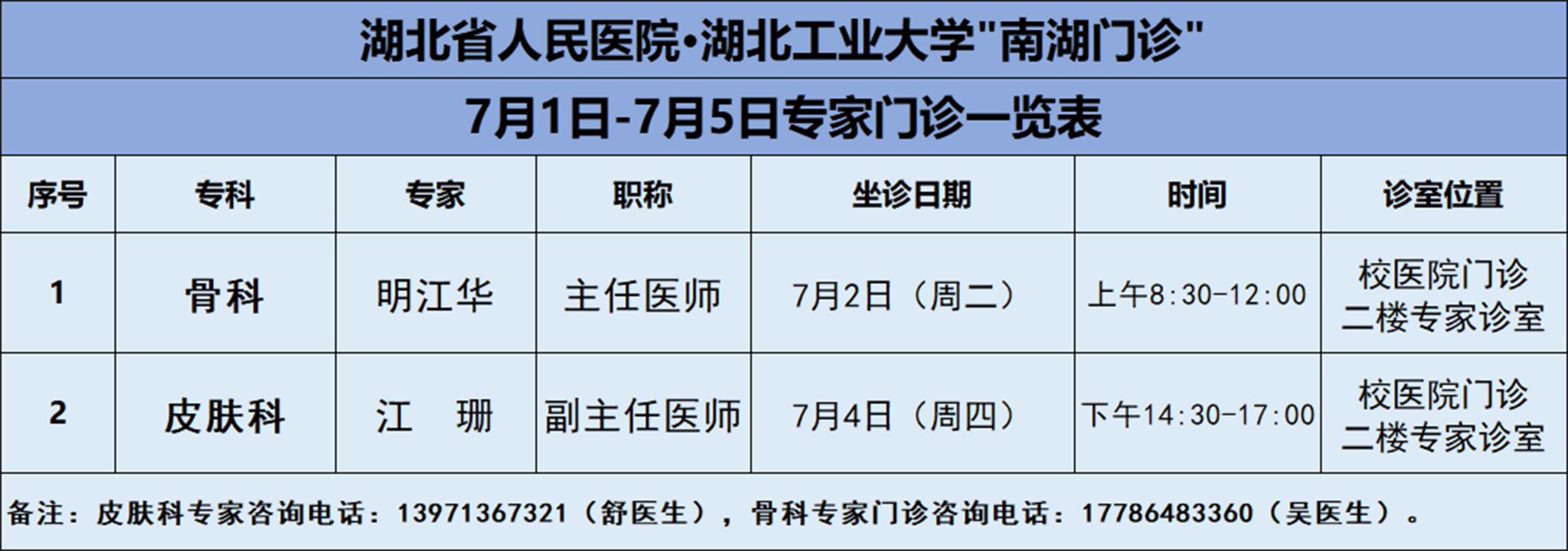 校医院将邀请湖北省人民医院知名专家——骨科明江华主任、皮肤科江珊主任两位专家教授前来校医院坐诊(具体坐诊信息见下),请广大师生、周边居民持续关注南湖门诊专家坐诊信息,如有骨科常见病(如骨质疏松症、骨质减少症、脆性骨折、创伤性骨折; 肌肉问题,如肌肉减少症; 脊椎问题,如背部和颈部疼痛;如肌肉骨骼局部和广泛的疼痛和炎性疾病)、皮肤科常见病(如单纯疱疹、带状疱疹、疣、脓疱疮、毛囊炎、疖、痈、蜂窝织炎、丹毒及麻风、头癣、体癣、股癣、手癣、足癣、接触性皮炎、湿疹、荨麻疹等),按需按时前来就诊,相关事宜可提前电话联系咨询。