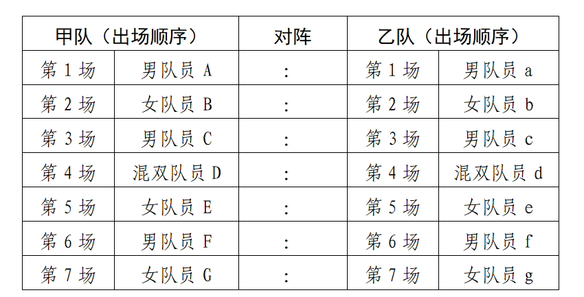 备注:第1、3、6场球由男队员比赛;第2、5、7场球由女队员比赛;第4场球由男、女混双队员比赛;每个队员只能参加一场比赛。